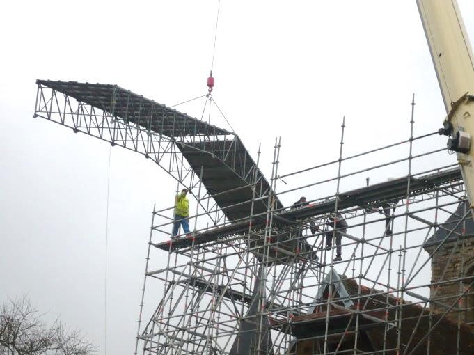 – Echafaudages de pied sur la totalité de l’église et mise en œuvre d’un parapluie en tôle et bâches au-dessus de la toiture sans appui.