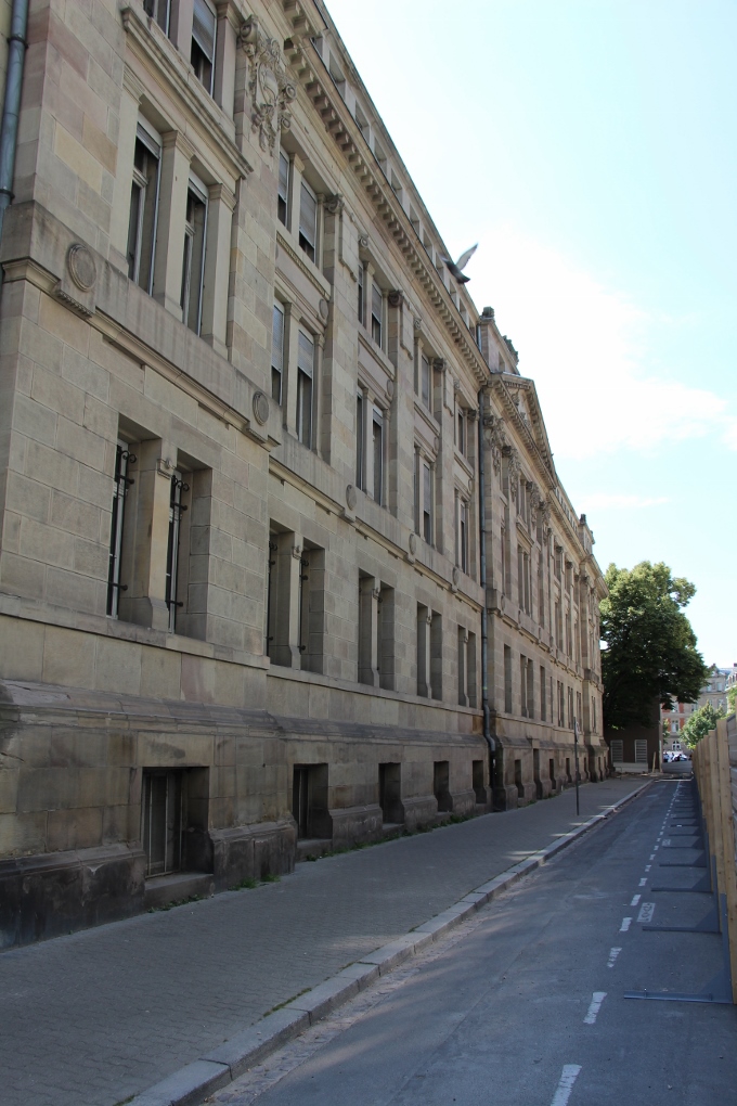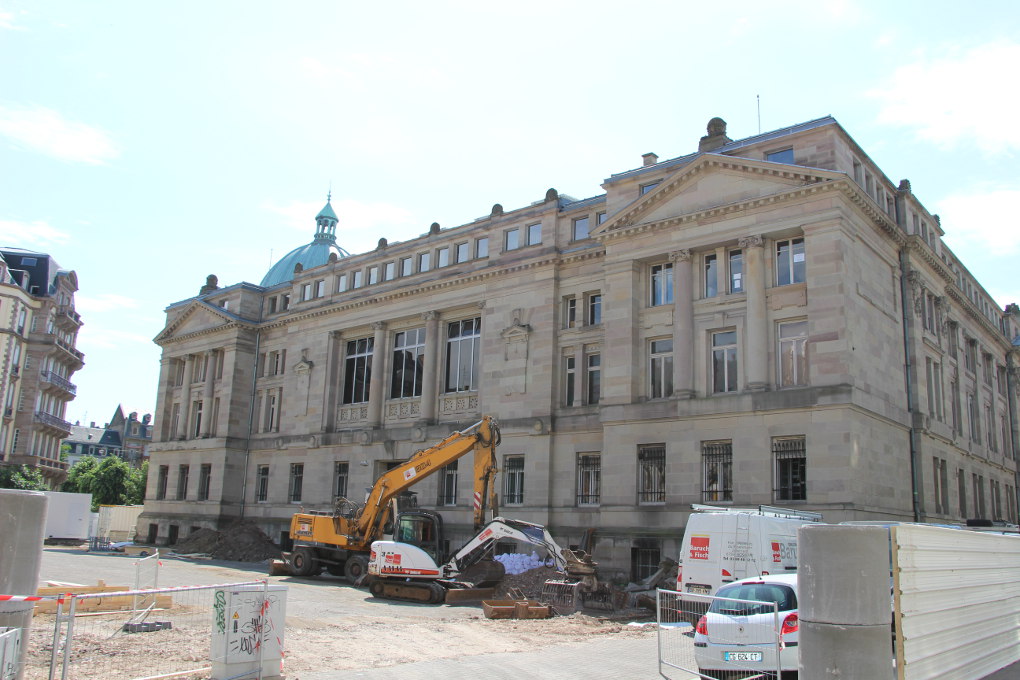 Une première phase consiste à créer un palais de justice temporaire grâce à des bâtiments modulaires installés sur le parvis du palais de justice et un tronçon de la rue Finkmatt afin que l’activité judiciaire puisse se poursuivre durant toute la durée des travaux.